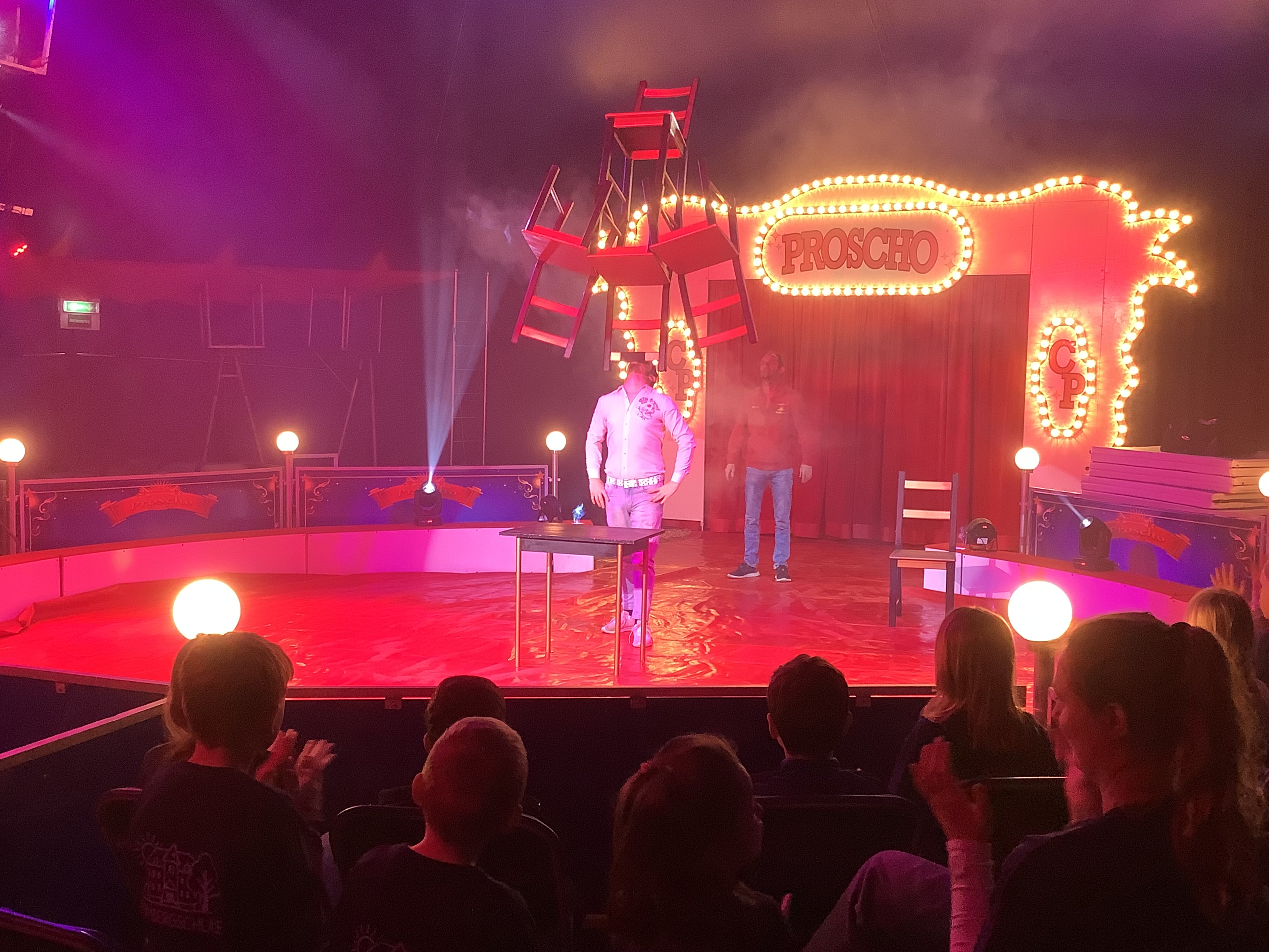 „Am 31.3.2025 begann unser Zirkusprojekt. Ich war bei der Trapezgruppe und unsere Trainerin heißt Isabell. Sie hat uns erklärt, wie wir aufs Trapez hoch und runter kommen. Aber ganz am Anfang, also am Montag, gaben sie uns eine Programmvorstellung. Danach haben wir uns in unseren Gruppen zusammengesucht. Aber wir haben noch nicht trainiert, sondern sind wieder zur Schule zurückgelaufen. Denn die zweite Gruppe war dran. In der zweiten Stunde, wo die Gruppe dran war, haben wir angefangen ein Zirkuszelt zu basteln. Wir haben Materialien von zu Hause mitgebracht. Am Dienstag ging es dann richtig los. Am Anfang haben wir noch leichte Sachen gemacht, wie das Vogelnest oder Seitenhänger. Später haben wir dann 2er oder 3er-Übungen gemacht wie z.B. den Dreimann oder den doppelten Kniehänger. Oder schwierige Einzelübungen wie den Grätschabfaller oder Capollo. […]“